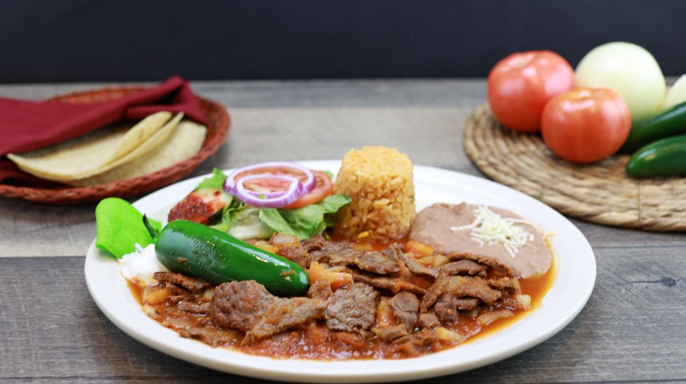Succulent pieces of steak stewed with our ranchero sauce. Served with Mexican rice, refried beans, sour cream, lettuce & tomatoes.