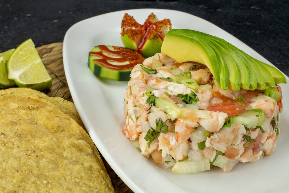 Fresh shrimp cooked in a lime-marinade, mixed with tomatoes, cilantro, cucumber and slices of avocado.